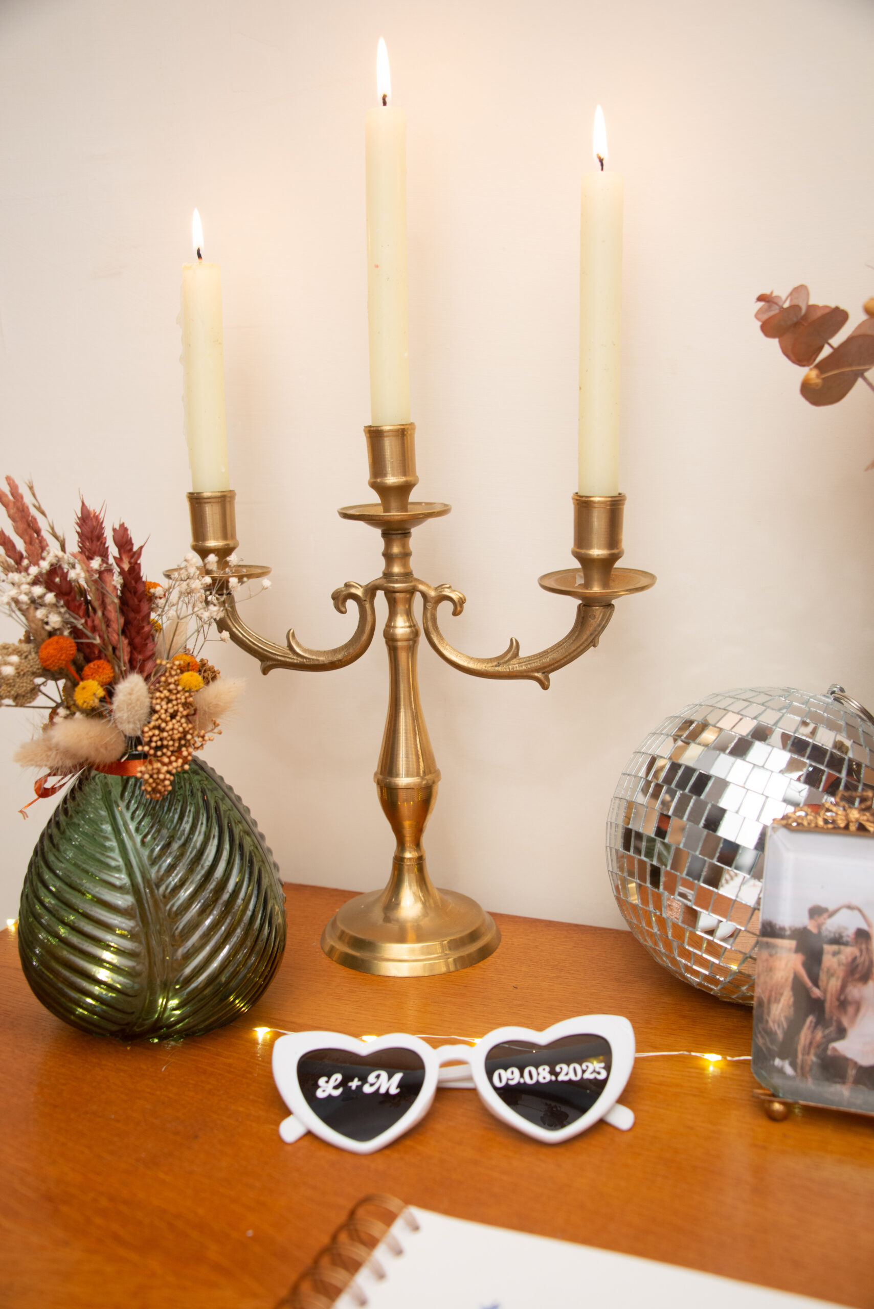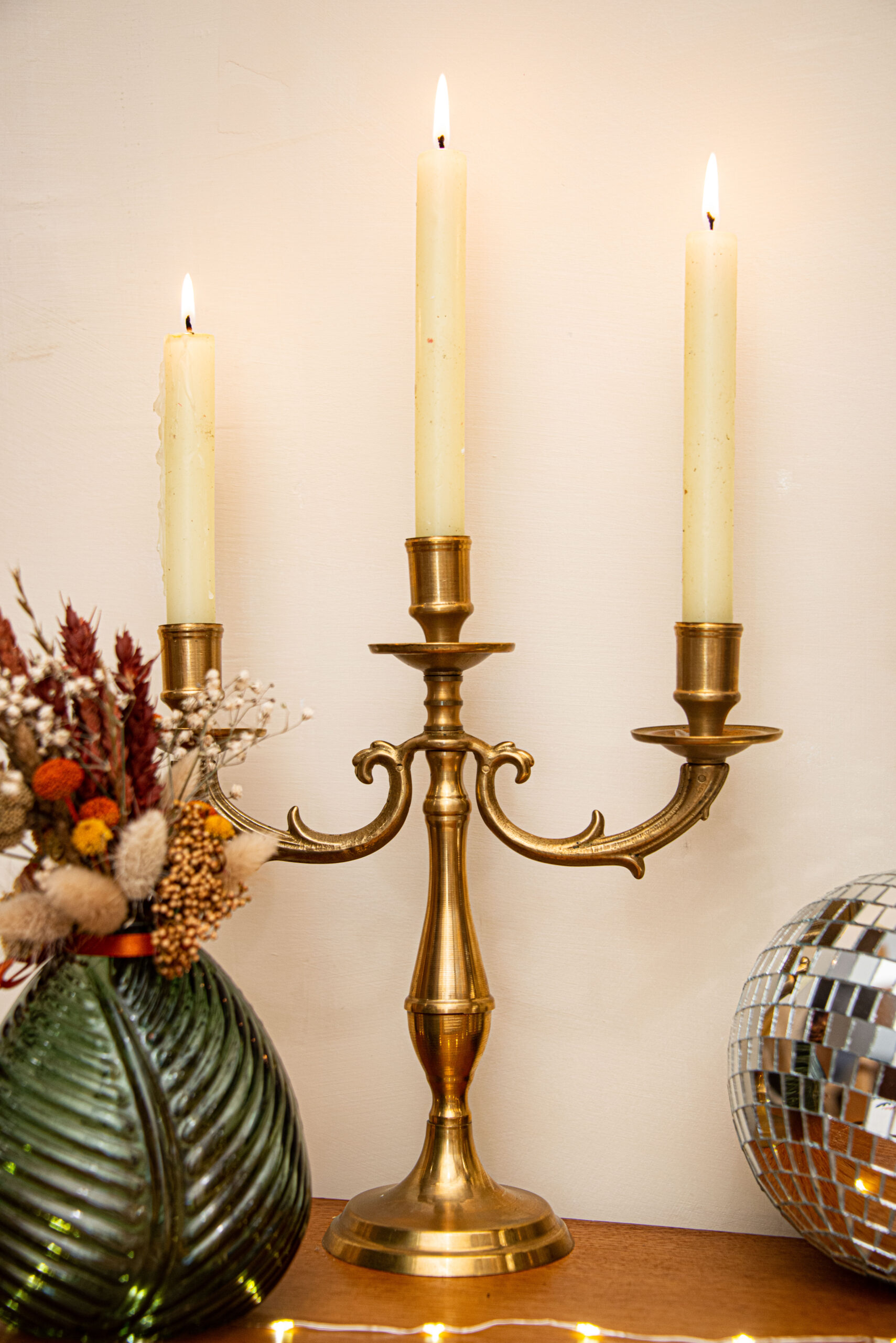 Élégant et intemporel, ce chandelier en laiton doré à trois branches apporte une touche raffinée à toutes vos décorations. Avec ses lignes classiques et son éclat chaleureux, il crée une ambiance chic et conviviale, parfaite pour une table de mariage, une décoration vintage ou une soirée romantique.