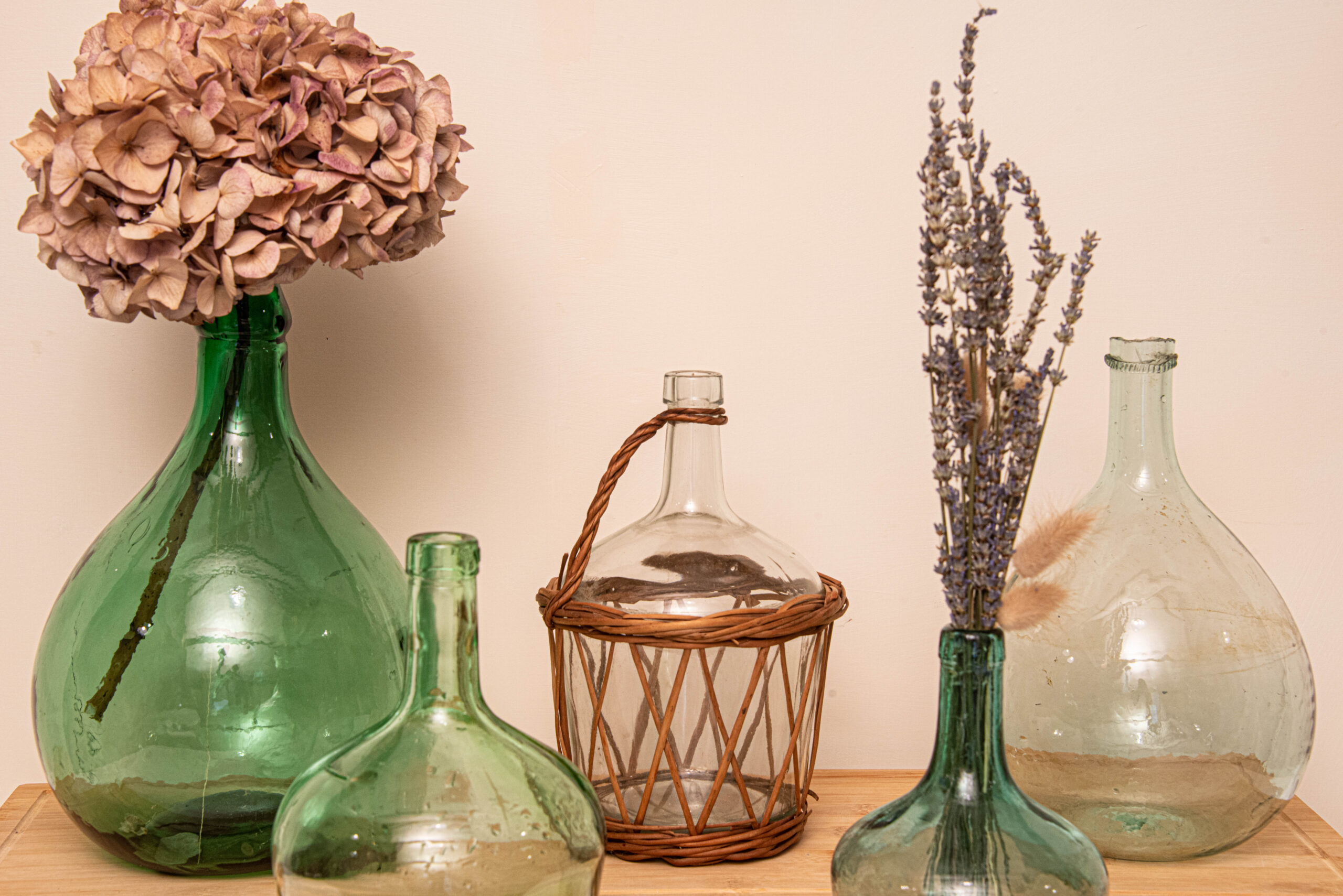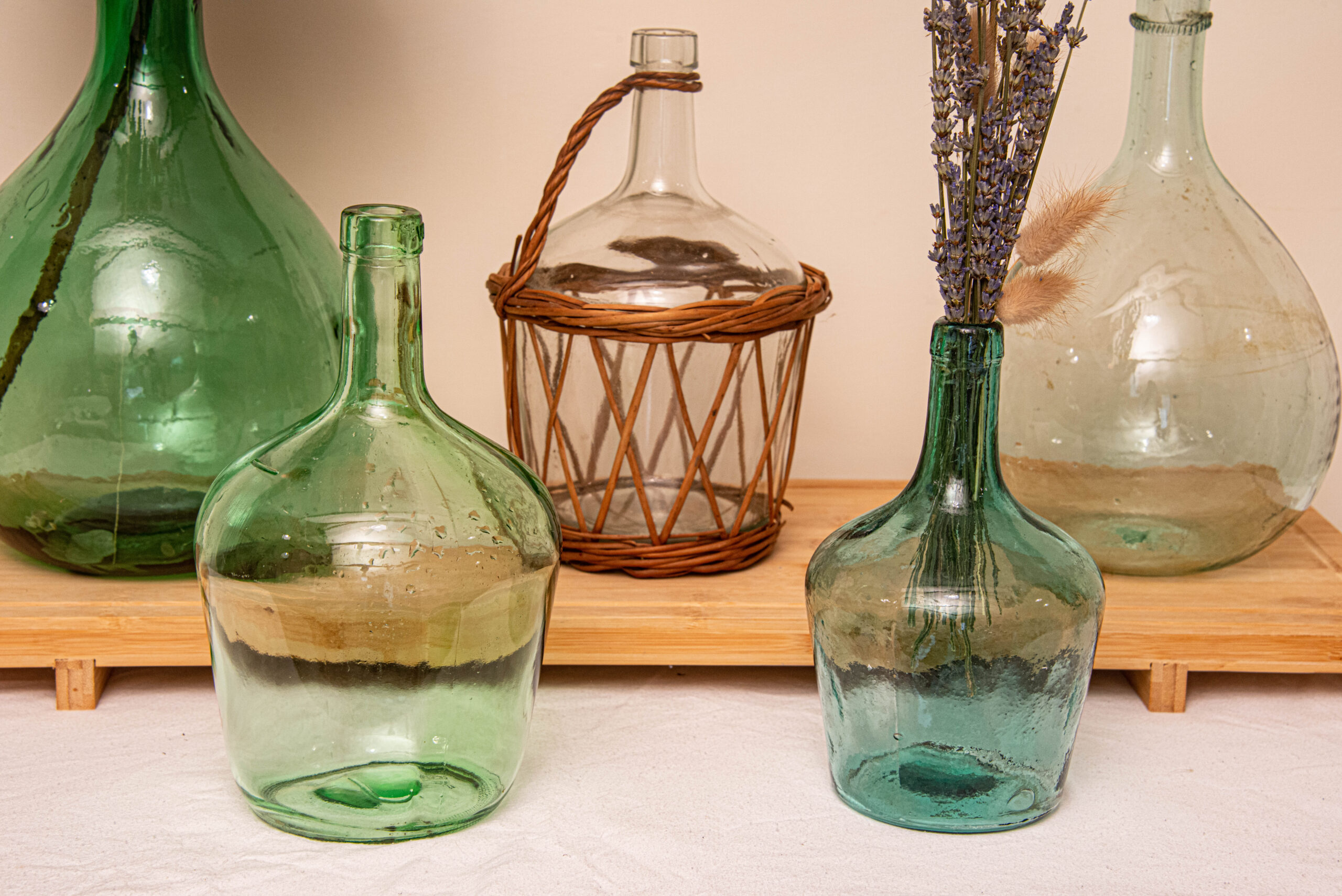 Ensemble de 5 petites dames-jeannes au charme authentique, parfaites pour une décoration vintage et naturelle. Les coloris varient du transparent au vert bleuté, avec une pièce unique habillée de son habillage en osier pour une touche encore plus rustique. Elles se prêtent idéalement à une mise en scène champêtre, bohème ou rétro lors de mariages, anniversaires ou autres événements.