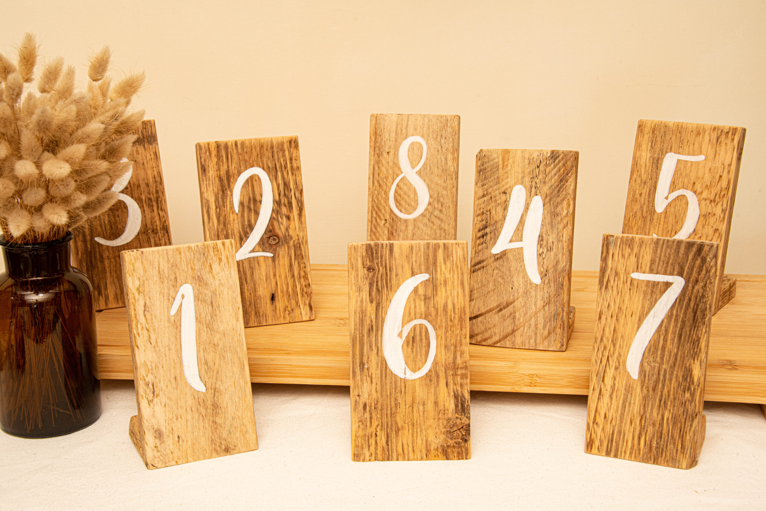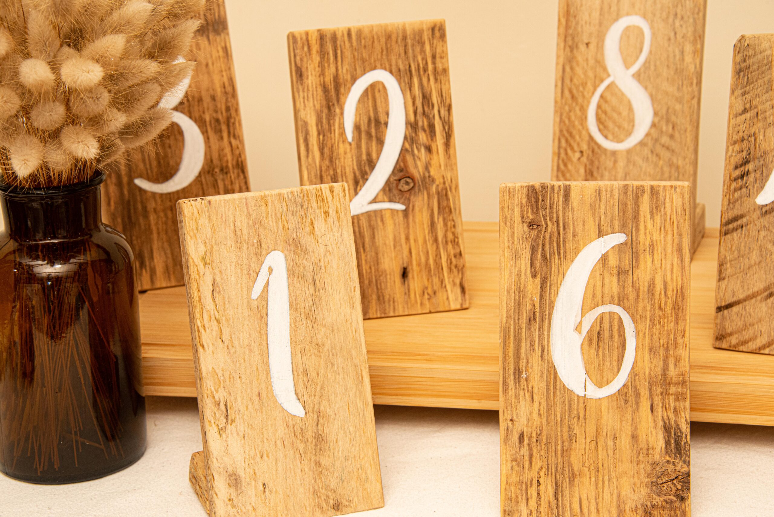 Apportez une touche naturelle et authentique à vos tables avec ces numéros en bois brut, peints à la main. Parfaits pour une déco champêtre, bohème ou vintage.