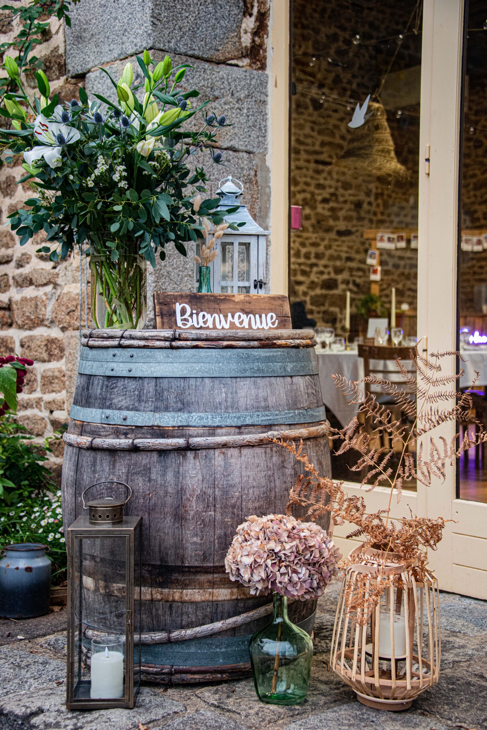 Parfait pour un mariage champêtre, bohème ou rustique, il s’intègre facilement sur un tonneau, une table ou à l’entrée du lieu de réception.