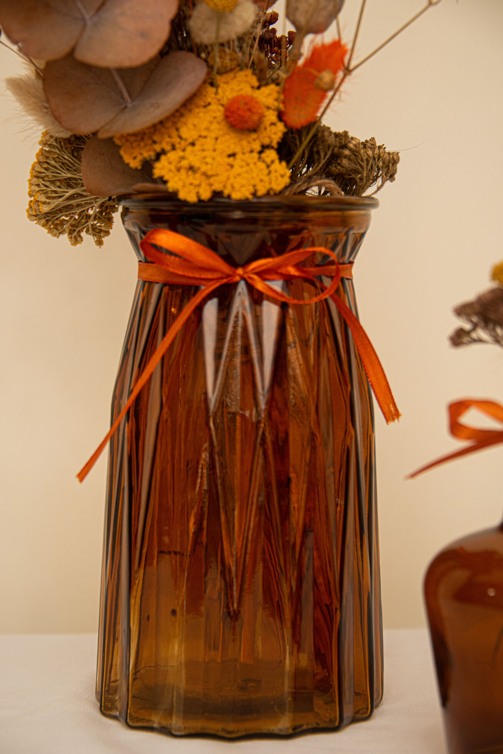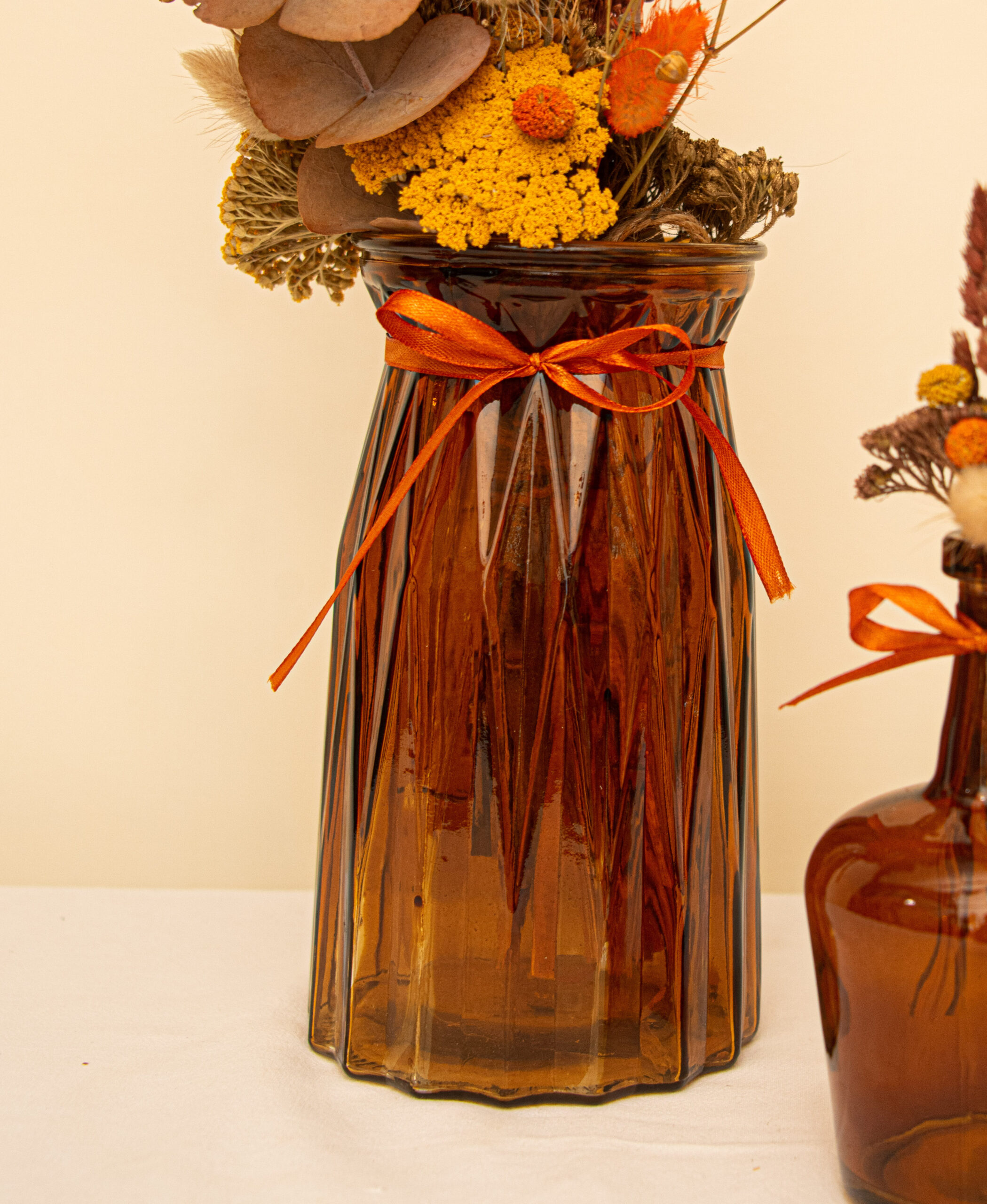 Vase en verre ambré à reliefs, idéal pour mettre en valeur des fleurs séchées ou fraîches. Sa teinte chaleureuse et son style rétro apportent une belle touche de caractère à vos décorations de table ou de salle.
