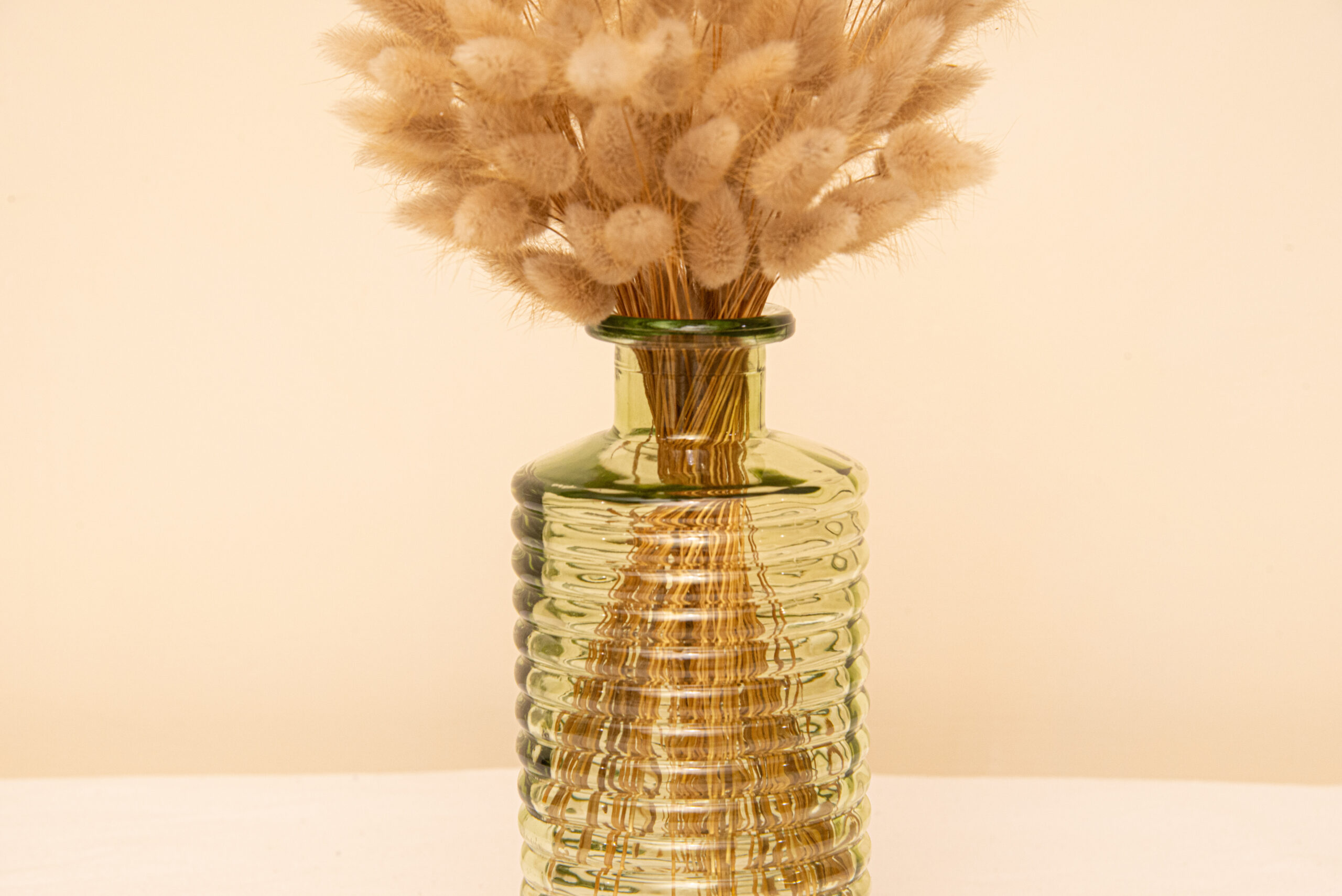 Vase en verre vert nervuré, idéal pour sublimer vos compositions florales lors d’un mariage champêtre ou bohème. Parfait en centre de table ou en déco d’appoint.